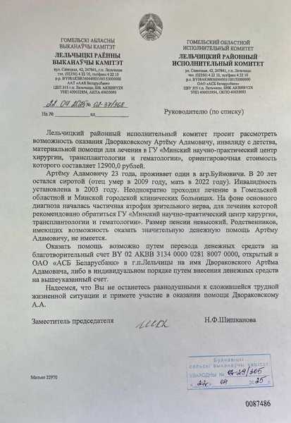 Оказать помощь возможно путем перевода денежных средств на благотворительный счет BY 02 AKBB 3134 0000 0281 8007 0000, открытый в ОАО «АСБ Беларусбанк» в г.п. Лельчицы на имя Двораковского Артёма Адамовича, либо путем внесения денег на номер телефона +375339900166.